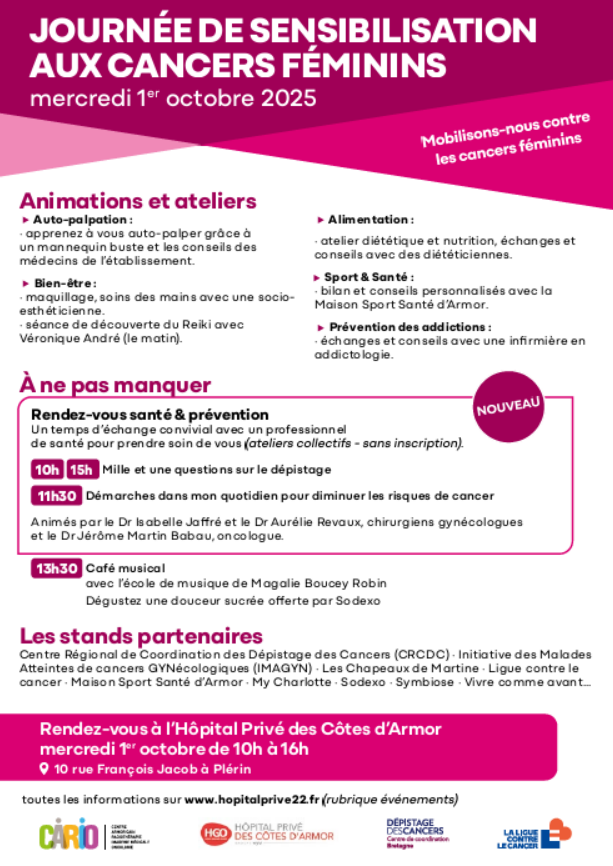JOURNÉE DE SENSIBILISATION AUX CANCERS FÉMININS – Hôpital Privé des Côtes d’Armor Plérin